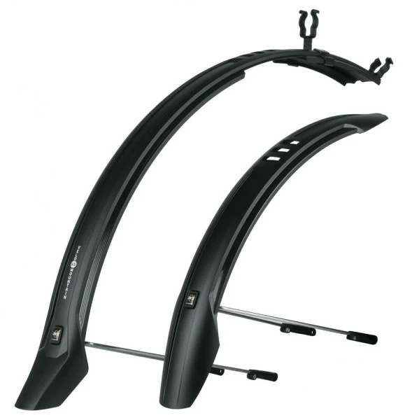 Bestehend aus schlagfestem, schwarzem Hochleistungskunststoff mit integriertem SKS-Logo, werten die Schutzbleche das Fahrrad auch optisch auf. Inklusive Rahmenclip und Unterlaufstreben.